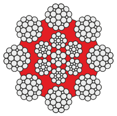 Kétszersodrott többrétegű, acélbetétes, műanyag betétezéses acélsodronykötél daruhoz.